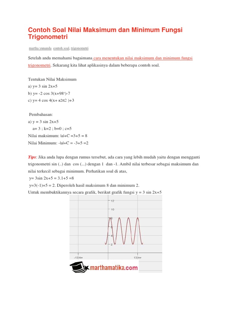 Tentukan Amplitudo Periode Serta Nilai Maksimum Dan Minimum Dari Fungsi Trigonometri Mas Dayat from 1.bp.blogspot.com Adakalanya anda mungkin perlu mengetahui nilai maksimum atau minimum sebuah fungsi kuadrat. Agar mempermudah pemahaman tentang bagaimana cara mencari nilai maksimum dan minimum fungsi ini, bisa dilihat contoh soal dan pembahasan tentang nilai maksimum dan nilai. Di video ini dijelaskan bagaimana cara menentukan nilai maksimum dan minimum fungsi trigonometri, materi ini merupakan sub. Untuk menentukan nilai maksimum atau nilai minimum suatu fungsi tujuan bukanlah suatu hal yang sulit apabila sudah diketahui daerah penyelesaian dari sistem selanjutnya kita menentukan nilai optimum dari $f(x,y)$ dan yang ditanyakan pada soal ini adalah nilai maksimum dari $f(x,y)=3x+5y$. Menggambar grafik fungsi menggunakan turunan konsep matematika koma. Titik stasioner pada sumbu y diperoleh dengan memasukkan nilai x yang telah diperoleh pada fungsi awal, sehingga Fungsi f pada r yang ditentukan oleh: Berikut ini materi lengkap tentang grafik fungsi trigonometri, mulai dari periode, nilai maksimum dan minimum, grafik fungsi sin cos tan, contoh soal.